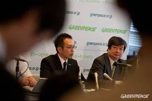 Greenpeace-Aktivist Junichi Sato (links) zusammen mit seinem Anwalt an einer Pressekonferenz. © Jeremy Sutton-Hibbert / Greenpeace Ziemlich genau zwei Jahre, nachdem Junichi Sato und Toru Suzuki einen…