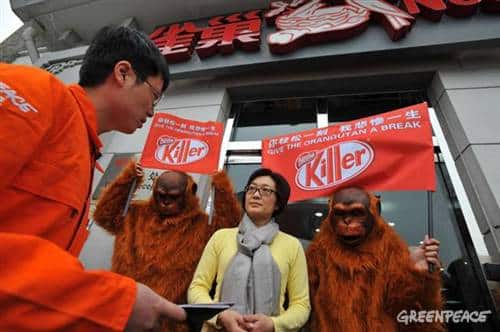 Die Greenpeace-Kampagne gegen die Zerstörung von Urwald für die Verwendung von Palmöl in Nestlé-Produkten wie Kit Kat geht unvermindert weiter. Auch beim Nestlé-Sitz in Jakarta demonstrierten als Orang-Utans…
