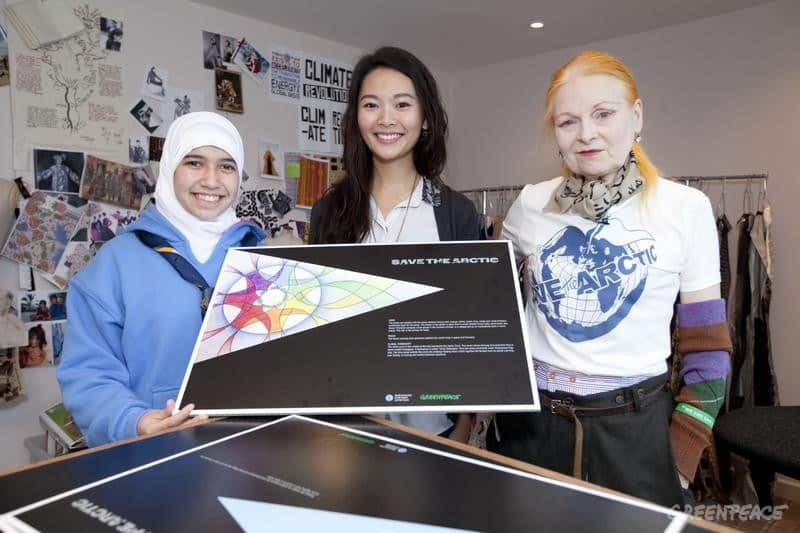 Die Jurorinnen Vivienne Westwood, Hilary Tam und Aishah Morshed, eine Pfadfinderin aus Irland, präsentieren das Gewinner-Design. © Vicki Couchman / Greenpeace Mittwoch, 20. März 2013 Die Jurorinnen Vivienne Westwood, Hilary…