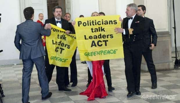 In der vorletzen Nacht der kopenhagener Klimakonferenz ist ein Greenpeace-Aktivistenpaar zum Gala-Dinner der dänischen Königin vorgedrungen. Auf dem roten Teppich entrollten die beiden ein Banner mit der Aufschrift “Politiker reden,…