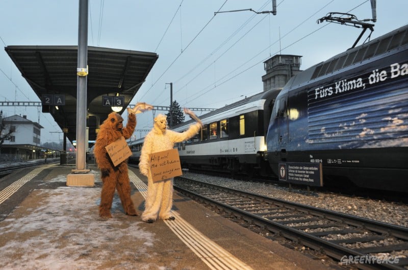 Heute reist Umweltminister Moritz Leuenberger mit Tross im SBB-Sonderzug nach Kopenhagen an die Klimakonferenz. Mit ihm unterwegs ist auch Greenpeace-Geschäftsleiter Kaspar Schuler. Eisbär und Orang Utan winken dem Klimazug nach…