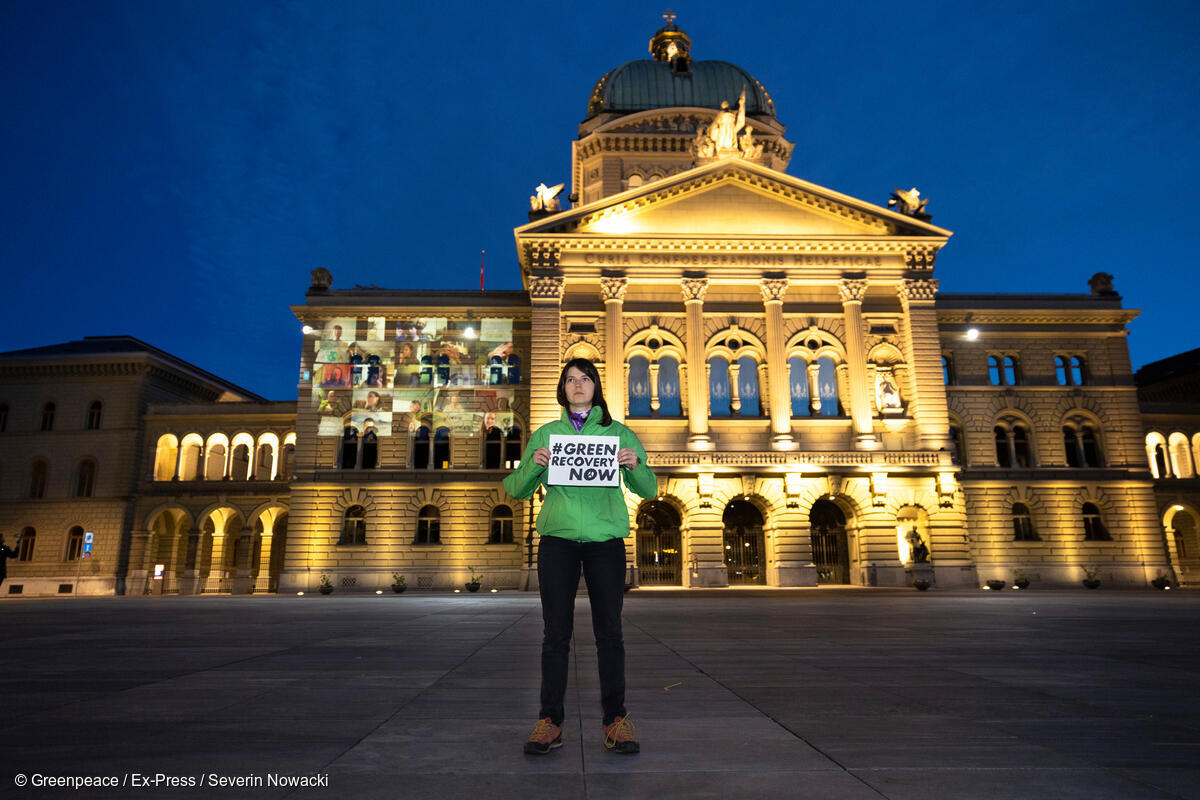 Greenpeace-Aktivisten projizierten am Sonntagabend nach Einbruch der Dunkelheit die Aufzeichnung der Online-Demonstration #GreenRecoveryNow an die Fassade des Bundeshauses. Mit der Aktion fordern sie von der Politik einen solidarischen und nachhaltigen Wiederaufbau, jetzt wo die…