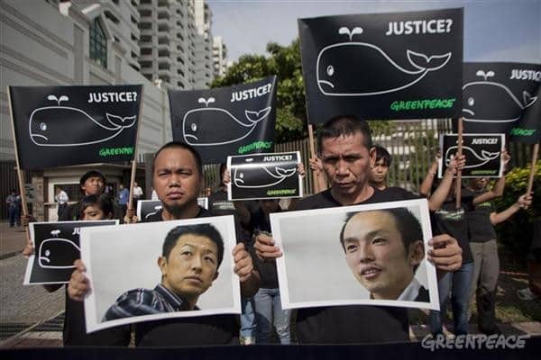 Proteste vor der japanischen Botschaft in Manila. © Luis Liwanag / Greenpeace Nach mehr als zwei Jahren hartnäckiger Arbeit und dem Einsatz unserer japanischen Kollegen Junichi Sato und Toru Suzuki…