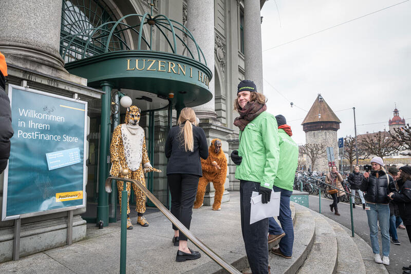 Greenpeace-Aktivist:innen besuchen Post in Luzern und bitten Mitarbeitende um Unterstützung – für eine klimafreundliche Pensionskasse