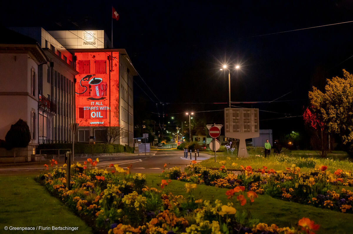Am Vorabend der Nestlé-GV projizierten Greenpeace-Aktivistinnen und -Aktivisten eine Reihe von Botschaften und Logos auf die Konzern-Gebäude in La Tour-de-Peilz VD. Sie wollten so die Aktionäre an ihre Verantwortung erinnern.