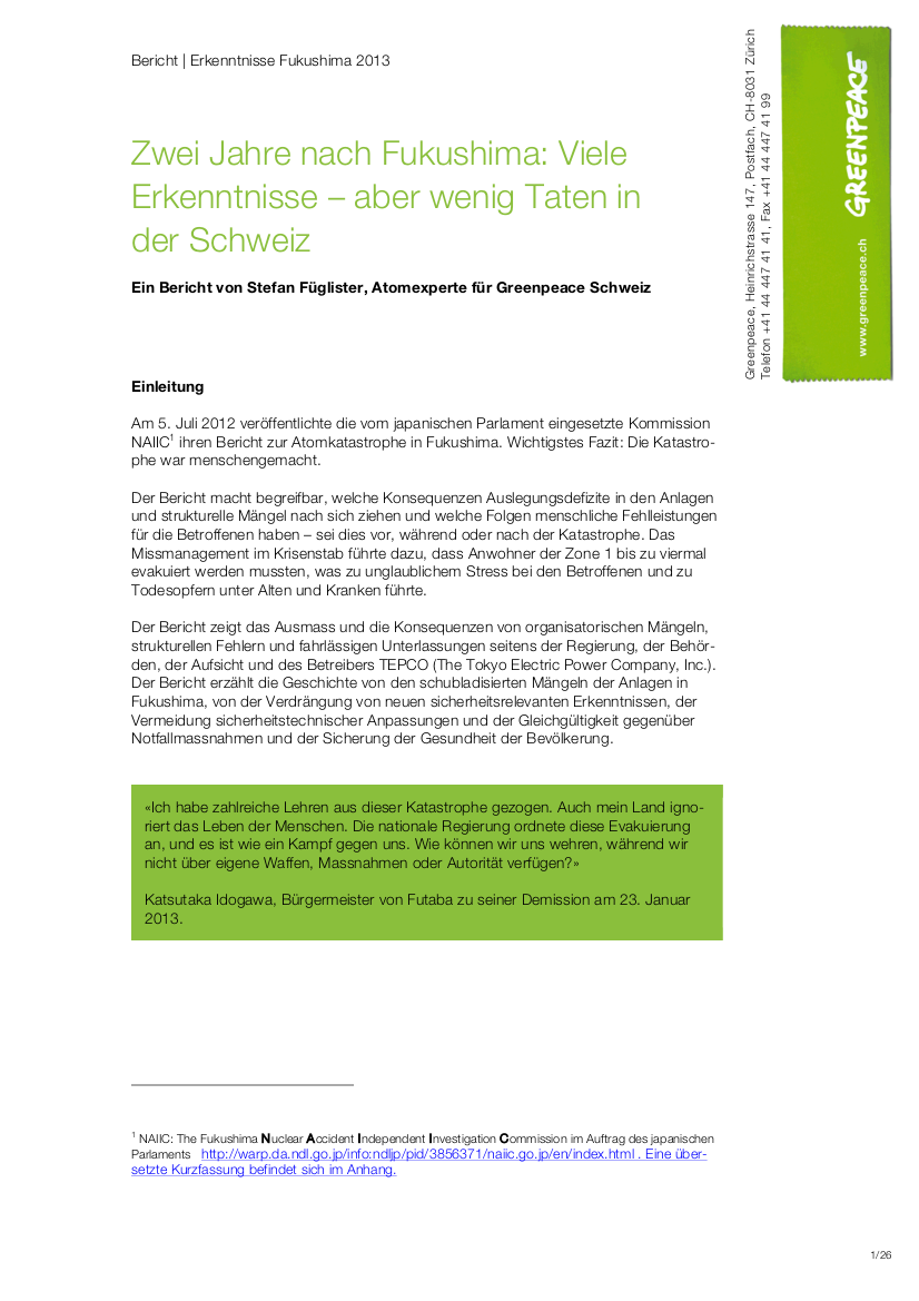 Zwei Jahre nach dem Atomunfall in Fukushima liegen bereits viele Erkenntnisse über dessen Ursachen und Folgen vor. Trotzdem findet in Japan wie auch in der Schweiz nur langsam ein Umdenken…