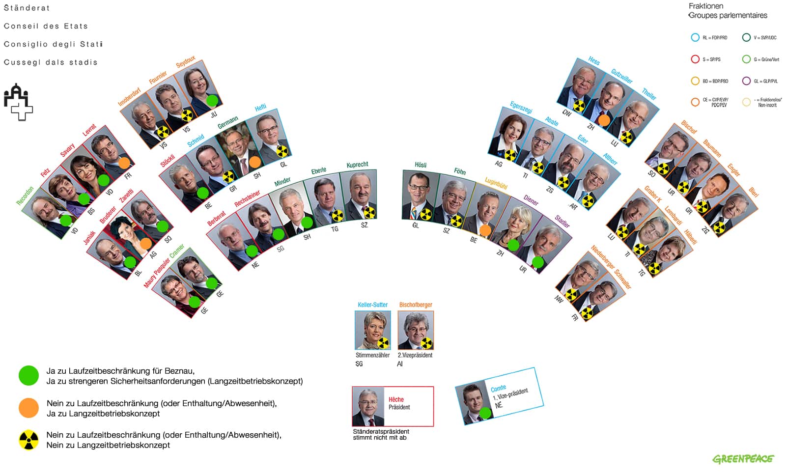 Ein ähnliches Bild zeigt sich bei den anderen grossen bürgerlichen Parteien: FDP und SVP bestätigen ihr Image als Atomturbos – wenngleich auch hier mit löblichen Ausnahmen: Ein FDPler und ein SVPler setzten immerhin für eine Verbesserung der Sicherheitsanforderungen für Alt-Reaktoren ein; ein Mitglied der SVP-Fraktion hat sogar der Laufzeitbeschränkung für Beznau zugestimmt.