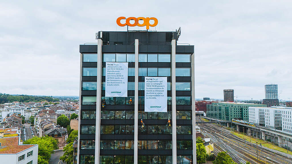 Mit einem spektakulären, friedlichen Protest appellieren 26 Greenpeace-Aktivist:innen an Coop und Migros, Verantwortung für ihre eigenen Klimaziele zu übernehmen. Mit grossen Bannern an den Hauptsitzen fordern sie die Detailhändler dazu auf, weniger Tierprodukte zu verkaufen. Eine Analyse von Greenpeace Schweiz enthüllte letzte Woche, dass Coop und Migros ihre Klimaziele nicht erreichen werden, wenn sie weiterhin so viel Fleisch, Fisch, Eier und Milchprodukte verkaufen.