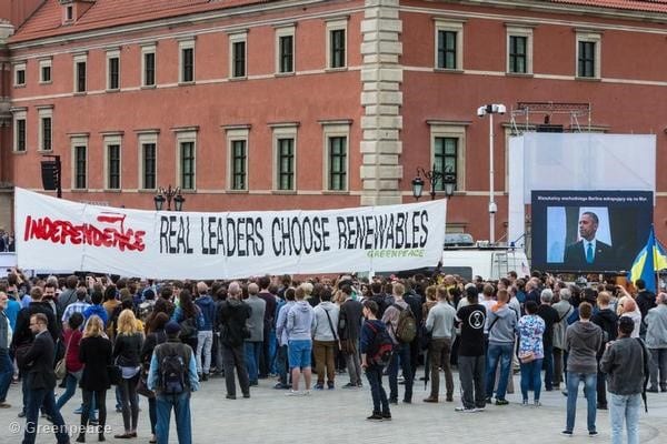 Nicht nur in Italien und der Schweiz sprechen sich die Menschen gegen die Kohle aus: Eine kürzlich veröffentlichte repräsentative Studie des Meinungsforschungsinstituts TNS Emnid zeigt, dass 83% der Bewohner in den G7-Staaten Energie-Effizienz und Erneuerbare als den richtigen Weg sehen, um sich aus der Abhängigkeit von ausländischen Energieträgern zu befreien. Diese Haltung haben gestern auch rund 30 Greenpeace-Aktivisten mit einem 10 Meter langen Banner während US-Präsident Obamas Rede zum 25. Jahrestag der freien Wahlen in Polen kundgetan. Ihre unmissverständliche Botschaft lautete: «Independence – Real leaders choose renewables». Obama reiste am Abend weiter an den G7-Gipfel in Brüssel.