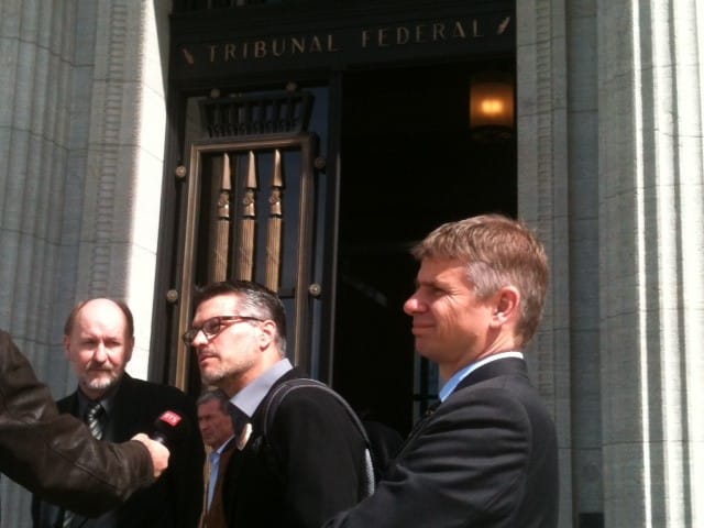 Anwalt Martin Pestalozzi und Anwohner der Alarmzonen Markus Kühni und Rainer Burki beantworten die Fragen der Journalisten vor dem Bundesgericht