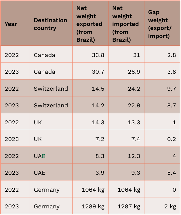 Eine Studie zeigt, dass 2023 rund 94 Prozent der Goldimporte aus Brasilien in die Europäische Union aus illegalen Quellen stammen, mit dem Amazonas als einem der Schwerpunkte. 2024 importierte die Schweiz aus dem Amazonas 4,5 Tonnen Gold. Das entspricht 23 Prozent – also fast ein Viertel – aller Goldexporte Brasiliens. Auffallend: 2022 überstiegen die Schweizer Importe die brasilianischen Exportangaben um 67 Prozent, 2023 um 62 Prozent. Das entspricht 9,7 (2022) bzw. 8,7 (2023) Tonnen Gold, deren Herkunft unklar ist (s. Tabelle). Im vergangenen Jahr importierte die Schweiz Gold aus Brasilien im Wert von über 948 Millionen Dollar.