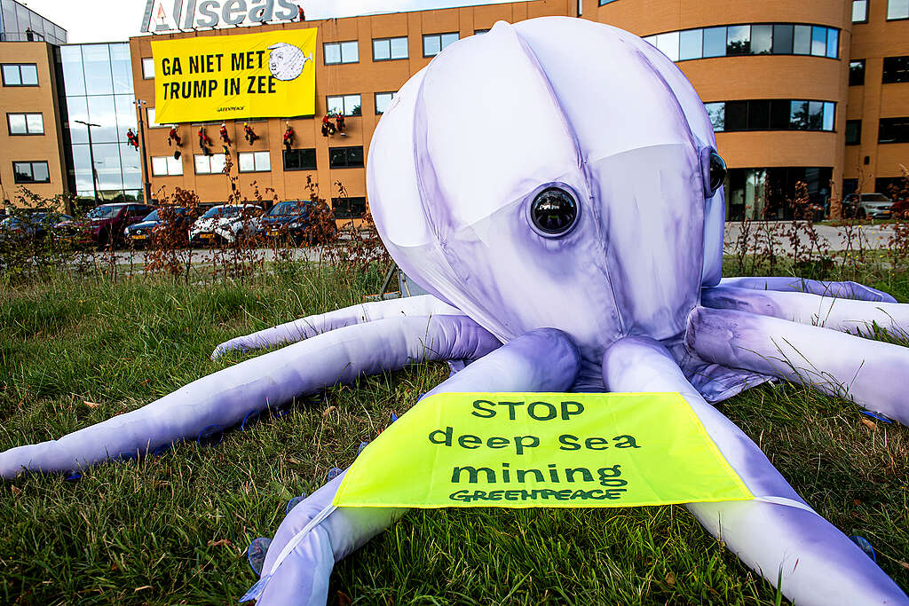Gleichzeitig mit der Übergabe des offenen Briefs in der Schweiz haben im niederländischen Delft Greenpeace-Aktivist:innen gegen Allseas protestiert. Allseas unterhält in den Niederlanden grosse Produktionsanlagen.