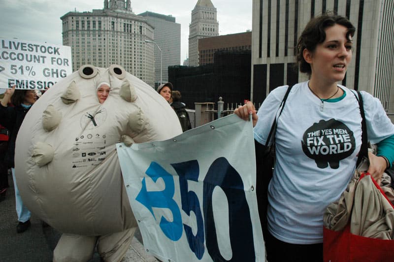 The Yes Men – das sind Jacques Servin und Igor Vamos, die als Andy Bichlbaum und Mike Bonanno Konzerne und Politiker parodieren. «Die Tatsache, dass es noch andere gab, die das Klimaproblem mit Humor anpacken wollten, tröstete mich ungemein», so Whitney, die Umweltwissenschaften studiert. «Wer sagt denn, dass es keinen Spass machen soll, die Welt zu retten?» Kampagnen, die mit düsteren Visionen vom Untergang Schuldgefühle wecken, seien doch ineffektiv und abgenutzt.