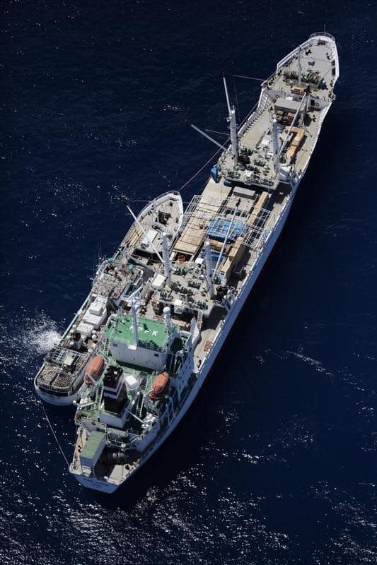 «Transshipping», das Umschlagen von Ladung auf offener See, ist eine verbreitete Praktik, bei der Fisch von einem Schiff zum anderen umgeladen wird. Fisch aus illegalem Fang kann auf diese Weise unkontrolliert in die Verarbeitungskette gelangen.