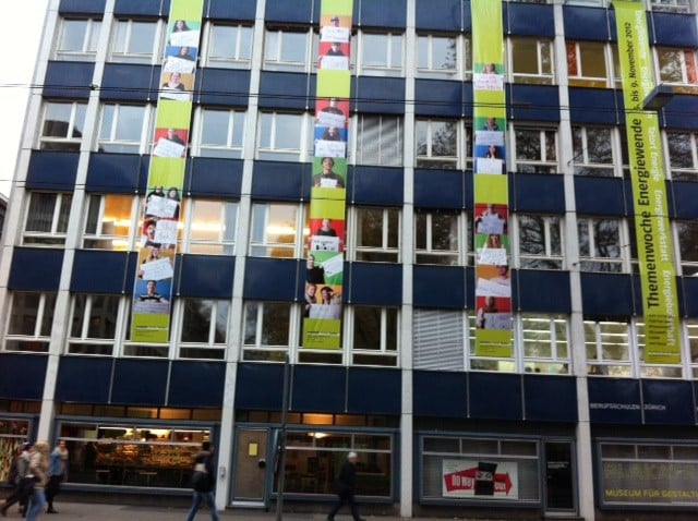 Die Zürcher Berufsschule für Gestaltung organisierte in der ersten Novemberwoche ganze fünf Tage zum Thema „Energiewende“. 1400 Schülerinnen und Schüler nahmen daran teil und setzten sich mit der Energiethematik auseinander. Ein Teil davon wurde von greenpeace betreut und beschäftigte sich unter anderem damit, fünf Solarpaneele auf dem Dach des Schulhauses am Limmatplatz aufzubauen.