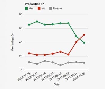 Mit rund 46 Millionen Dollar war das Abstimmungsbudget der Industrie etwa sechs mal höher als jenes der Deklarationsbefürworter, wo sich Bügerbewegungen, lokale Bauern und Bio-Produzenten organisiert hatten. Das finanziell hochaus überlegene Nein-Komitee war zu mehr als 99 Prozent von Konzernen finanziert, im Gegensatz zum Ja-Komitee, das sein Budget zu einem Drittel von Bürgern gespendet bekam, der Rest kam aus der Biobranche. Der Food- und Pestizid-Industrie ist es damit gelungen, die Stimmung in der Bevölkerung innert zwei Monaten zu kippen : Befürworteten laut Umfragen Anfang September noch 65 Prozent die Initiative, warfen schliesslich 63 Prozent ein «Nein» ein. Der Unterschied zwischen dem Ja und dem Nein-Lager betrug nach der Auszählung 500’00 Stimmen.