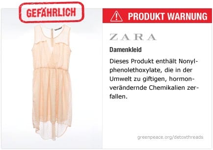 Wir sind der Ansicht, dass Zara Verantwortung gegenüber der Öffentlichkeit und der Umwelt trägt und alle gefährlichen Chemikalien aus ihren Textilien und aus deren Produktionsprozess eliminieren muss. Überdies muss die Firma Zara von ihren Zulieferbetrieben verlangen, offenzulegen, welche Chemikalien sie in unsere wertvollen Wasserwege einleiten. Sowohl die Menschen, die in der Nähe dieser Fabriken leben, als auch jene, die solche Produkte kaufen, haben das Recht darauf zu erfahren, was in diesen Kleidungsstücken enthalten ist und welche gesundheitsschädlichen Auswirkungen diese Chemikalien haben können, wenn sie in die Umwelt abgegeben werden.Einige von Zaras Konkurrenten haben bereits gezeigt wie es geht. So hat sich beispielsweise Marks & Spencer dazu verpflichtet, bis Februar 2013 Einzelheiten zur Umweltverschmutzung durch einige Zulieferbetriebe zu veröffentlichen. Auch Nike, Puma, Adidas, Marks&Spencer, H&M, C&A und Li Ning haben sich zur Entgiftung verpflichtet. Worauf wartet Zara?
