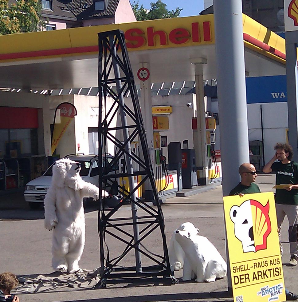 Umweltschützer aus der ganzen Welt strömen derzeit aus, um die Arktis vor der Gier der Ölkonzerne zu schützen. An der Shell-Tankstelle am Basler Lothringerplatz demonstrierte heute die lokale Greenpeace-Regionalgruppe gegen die Arktis-Ölbohrpläne des niederländischen Konzerns, an dessen Spitze der Schweizer Peter Voser steht.
