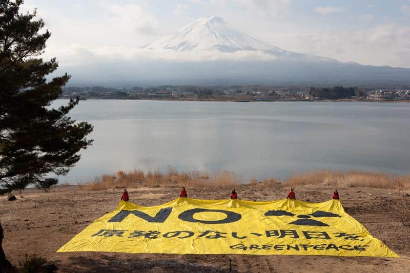 Anschliessend hat eine zweite Aktivisten-Gruppe beim Kawaguchiko-See am Fuss des Mont Fuji einen grossen Transparent mit dem Text „No Nukes“ (Nein zu Atomkraft) aufgemacht.