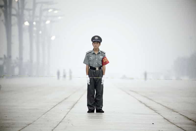 Umgeben von dickem Smog, bewacht ein Securitas das Olympiastadion «Vogelnest»