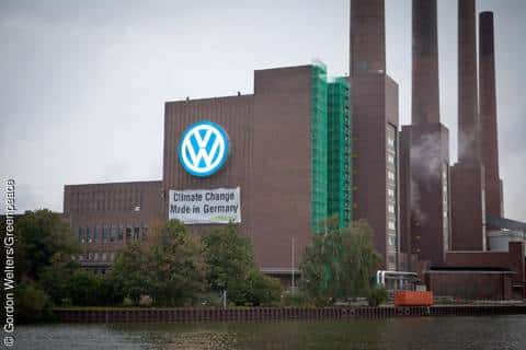 Greenpeace-Banner an der Volkswagen-Zentrale in Wolfsburg.