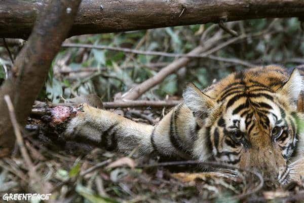Kürzlich erreichte Greenpeace Indonesien die Meldung, dass ein Sumatra-Tiger in einem von Asia Pulp and Paper (APP) zur Rodung freigegebenen Gebiet in eine Wildtierfalle geraten ist, aus der er sich aus eigener Kraft nicht mehr befreien kann. Ohne Nahrung oder Wasser war das Tier schon seit sechs Tagen in dieser prekären Situation gefangen. Als die Forstbeamten den Tiger endlich erreichten, um ihn nach einer Woche des Leidens zu befreien, war es bereits zu spät. Der Tiger verendete noch während der Rettungsaktion.