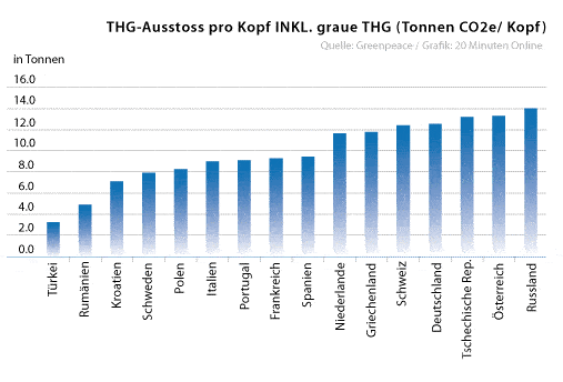 Während die Türkei auf dem Siegerpodest thront, liegt die Schweiz im Euro-Klimarating ganz hinten, knapp vor Deutschland, nach den meisten anderen Nachbarn. Dabei schlagen für sie vor allem die grauen Energien zu Buche. Diese stecken in allen Gütern, deren CO2 zwar in anderen Ländern verursacht wird, die wir jedoch importieren und konsumieren.