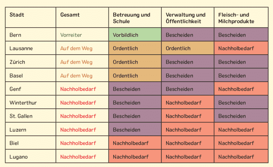 Inwiefern gehen die Schweizer Städte bei der Beschaffung von Lebensmitteln mit gutem Vorbild voran? Wir wollten es genau wissen und haben deshalb die Ernährungsrichtlinien der zehn grössten Schweizer Städte untersucht. Greenpeace Schweiz hat dabei überprüft, welche Regeln für die Ernährung von Kindern in familienergänzenden Betreuungsstrukturen gelten, was die Städte im sonstigen Verwaltungsbereich sowie in der Öffentlichkeitsarbeit unternehmen, und wie konsequent tierische Produkte in den Richtlinien berücksichtigt werden.