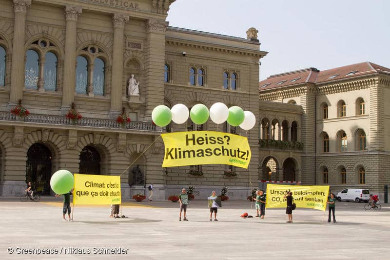 Die Klimakrise, die seit Monaten auch hierzulande deutlich zu spüren ist, zeigt: Die Schweiz muss dringend effektive Massnahmen gegen die Klimaerhitzung ergreifen. Doch das Parlament hat bislang in Sachen Klimaschutz versagt. Deshalb haben Greenpeace-AktivistInnen gestern und heute mit zwei Aktionen in Zürich und Bern die verantwortlichen PolitikerInnen aufgefordert, endlich die Weichen für den Ausstieg aus den fossilen Energien zu stellen.