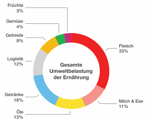Nahrungsmittel machen heute 27% der Umweltbelastung der Schweizer Haushalte aus. Dies ist vor allem auf den hohen Anteil an Fleisch und Milchprodukten in unserer Ernährung zurückzuführen. Um eine tierische Kalorie zu produzieren, benötigt es ein Mehrfaches an pflanzlichen Kalorien. Bei der Herstellung von pflanzlichen Lebensmitteln, werden deutlich weniger Platz, Energie und Wasser benötigt. Neben der deutlichen Reduzierung der tierischen Lebensmittel, verlangt eine klima- und umweltfreundliche Ernährung die Reduktion von Lebensmittelabfällen und die Bevorzugung von saisonalen und biologisch produzierten Nahrungsmitteln.