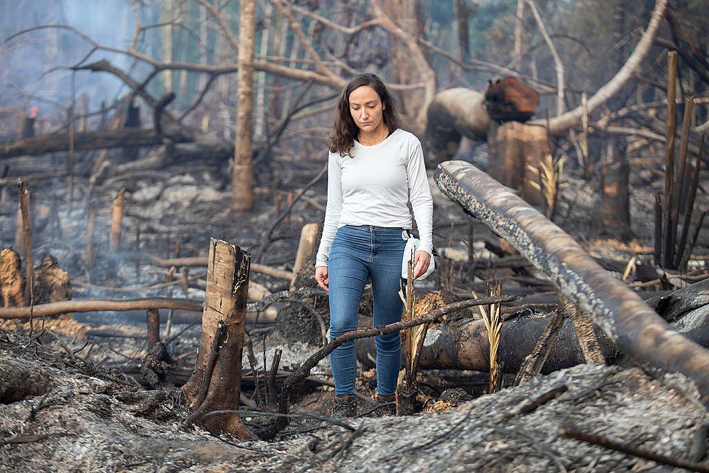 Cristiane Mazzetti, Kampagnenleiterin von Greenpeace Brasilien, geht durch ein kürzlich abgebranntes Gebiet im südlichen Amazonasgebiet. © Nilmar Lage / Greenpeace