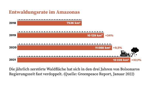 Im Januar 2022 feierte Jair Bolsonaro dreijähriges Amtsjubiläum als Präsident von Brasilien. Doch für das Klima und die Biodiversität Brasiliens gibt es wenig Grund zu feiern. Greenpeace zog in einem Report Bilanz über die Politik des Präsidenten. Das Ergebnis erschreckt: 75,6 Prozent mehr Abholzung, 10 Prozent mehr Treibhausgas-Emissionen, 1500 neu zugelassene Pestizide, fast 40 Prozent mehr Landkonflikte.