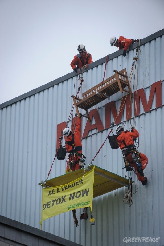 Die AktivistInnen laden den Konzern ein, am mitgebrachten Verhandlungstisch gemeinsam eine Lösung zu finden und ein Detox-Commitment zur Eliminierung der schädlichen PFC aus der ganzen Produktionskette zu unterzeichnen. Sie backen dort oben Kuchen, kochen Kaffee und sind gewillt, da zu übernachten. Und sie werden sicherlich die eine oder andere Überraschung parat haben. Weitere Aktivitäten, etwa eine PFC-Infoshow, finden vor dem Haupteingang statt. «Die Mammut-Angestellten sind eingeladen, bei einem Teller Suppe über die Kampagne und die Forderungen der AktivistInnen und Alternativen zu PFC zu diskutieren», sagt Julia Bangerter, Leiterin der Detox-Kampagne von Greenpeace Schweiz. «An die Mammut-Geschäftsleitung appellieren wir, in der Branche eine Vorbildrolle wahrzunehmen und ihre Verantwortung gegenüber Mensch, Tier und Umwelt nicht nur ständig zu betonen, sondern effektiv umzusetzen: PFC-Chemikalien haben in der Natur, in der Nahrung und im Trinkwasser nichts zu suchen.»