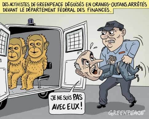 Als Orang-Utans verkleidete Greenpeace Aktivisten werden vor dem Finanzdepartement verhaftet. Merz: «Ich gehöre nicht zu denen!» Die gestrige Aktion der Orang-Utans vor dem Büro von Bundesrat Merz hat den Zeichner…