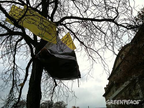 Heute in der Früh besetzten als Orang-Utans verkleidete Greenpeace-AktivistInnen Vordächer und Bäume vor den Fenstern der Büros der Bundesräte Merz, Leuthard und Leuenberger. Mit Transparenten fordern die Umweltschützer die Minister…