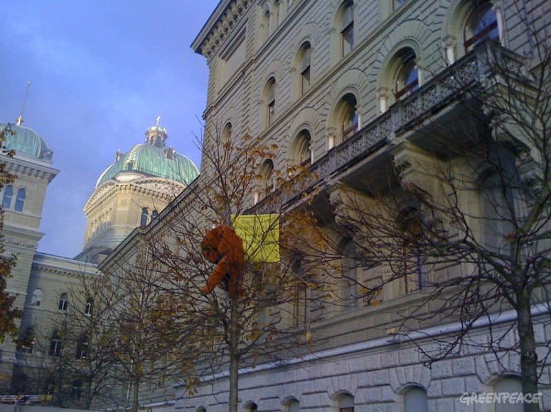 Heute früh sind als Orang-Utans verkleidete Greenpeace-Aktivisten auf Vordächer und Bäume vor den Fenstern der Bundesräte Merz, Leuthard und Leuenberger geklettert. Nach etwa einer Stunde wurden drei Aktivisten, die friedlich…
