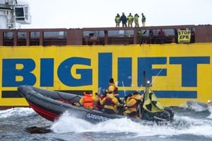 Greenpeace-Aktivisten haben heute Nachmittag im Fehmarnbelt gegen die Ladung der Happy Ranger protestiert. Der Schwerlastfrachter transportiert Dampferzeuger für den Neubau des Europäischen Druckwasserreaktors (EPR) im finnischen Olkiluoto. Fünf Schlauchboote mit…