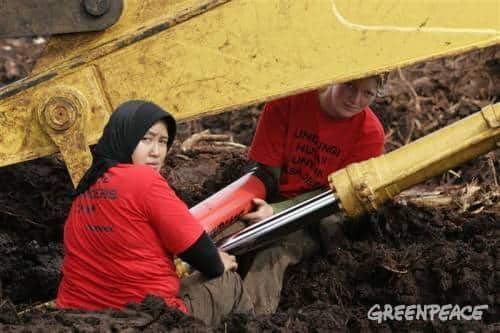 Zwei Greenpeace Aktivistinnen blockieren am vergangenen Donnerstag einen Bagger des Klimaverbrechers APRIL (©Greenpeace / Ardiles Rante) Endlich in Pekanbaru, Riau auf Sumatra angekommen und nur noch ein paar Stunden vom…