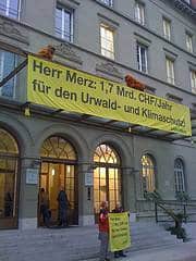 In diesem Moment sind als Orang Utans verkleidete Aktivisten auf das Vordach des Finanzministeriums gestiegen. Sie fordern vom Bundesrat einen jährlichen Beitrag von 1.7 Mrd. CHF in einen globalen Fonds…