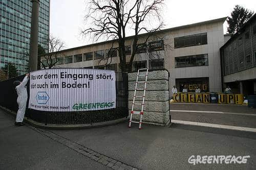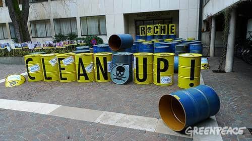 Nach dubioser Müllentsorgung und Wortbruch: Greenpeace-Aktion bei Roche Greenpeace-Protest vor dem Roche Hauptsitz in Basel.©Greenpeace Weil Roche die Vereinbarung mit Greenpeace nicht mehr einhalten will, haben Greenpeace-Aktivisten heute morgen symbolische…