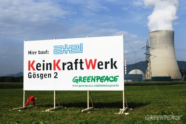 Nachdem Greenpeace-Aktivisten gestern 3 Bautafeln, die mit “Hier entsteht Kein Kraft-Werk!” angeschrieben sind, an den Standorten Gösgen, Beznau und Mühleberg aufstellten, griff die AKW-Gösgen-Betreiberin Atel zu illegalen Mitteln, um eine…