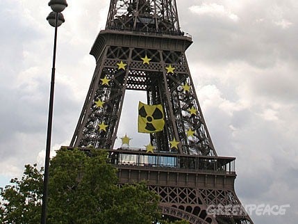 Heute haben 15 Greenpeace Aktivisten, darunter fünf Schweizer, ein Banner mit dem radioaktiven Logo am Pariser Eiffelturm befestigt. Das Banner wurde genau in die Mitte eines Kreises aus goldenen Sternen…