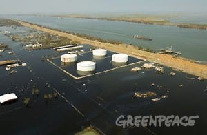 Cyrill Studer, Klima- und Verkehrskampagner bei Greenpeace sagt dazu: Die Verschmutzung nach dem Sturm: Ein Tanklager in am Ufer des Mississippi, nach dem Hurrikan Katrina.© Greenpeace/Aslun «Die SVP fährt gegen…