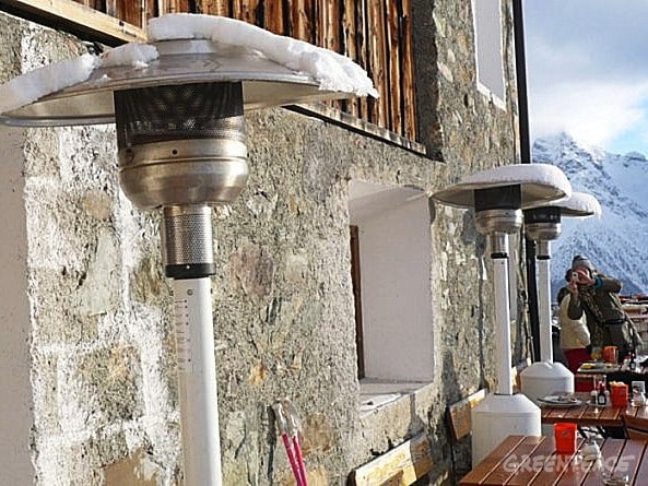 Greenpeace fordert ein Verbot von Aussenheizungen Heizpilze vor einer Skihütte. ©Greenpeace Zürich. Wärmestrahler oder so genannte Heizpilze verbreiten sich rasant, vor allem in Restaurantgärten und vor Strassencafés. Das zeigen der…