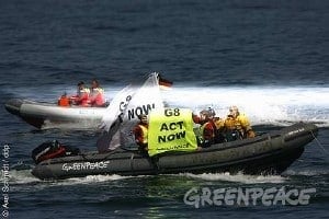Elf Greenpeace-Schlauchboote sind heute von Osten und Westen in das so genannte Grosse Seegebiet vor Heiligendamm eingelaufen. Auf Fahnen und Flaggen forderten die Aktivisten die versammelten Regierungschefs der G8 zum…