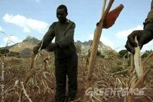 Greenpeace-Studie warnt vor humanitärer Katastrophe Malawische Bauern zeigen ihre zerstörte Maisernte während der Dürreperiode 2002. © Clive Shirley / Greenpeace Sie packen ihr weniges Hab und Gut und gehen. Nicht…