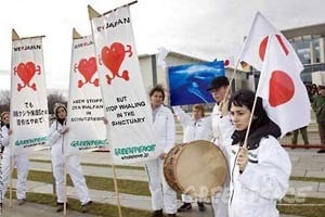 Greenpeace-AktivistInnen haben am Mittwoch den japanischen Ministerpräsidenten Shinzo Abe in Berlin empfangen. Sie begrüssten ihn vor dem Bundeskanzleramt mit Protestbannern in drei Sprachen: Wir lieben Japan, aber stoppt den Walfang…
