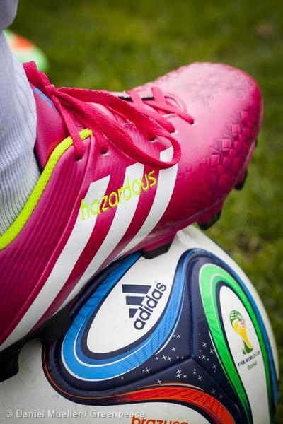Zürich, 19.5.2014. Fussballschuhe und Torhüter-Handschuhe der WM-Kollektion von Adidas, Nike und Puma sowie der WM-Ball Brazuca enthalten eine breite Palette gefährlicher Chemikalien. Dies zeigt eine neue Greenpeace-Untersuchung von 33 Produkten,…