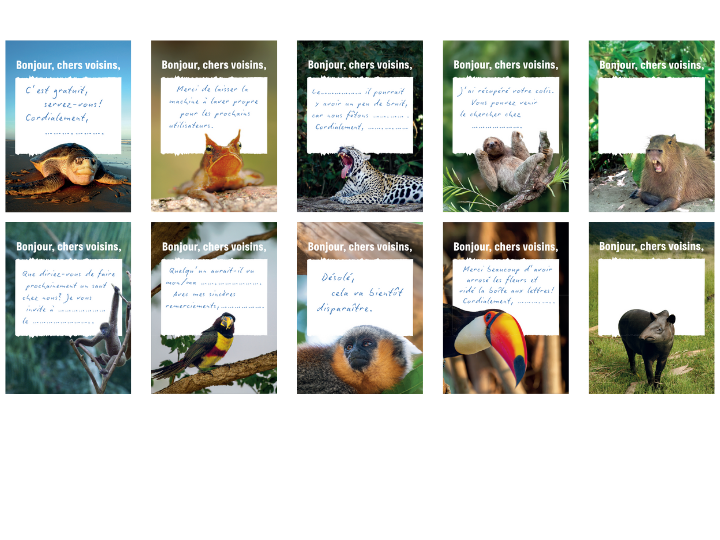 Chaque bloc contient 50 feuilles avec 10 motifs d’animaux différents et de courts messages préimprimés, conçus avec amour, surprenants et toujours facétieux. Vous trouverez également 8 motifs vierges sur lesquels vous pourrez laisser vos propres messages: un remerciement, un rappel, une remarque ou simplement un bonjour amical.