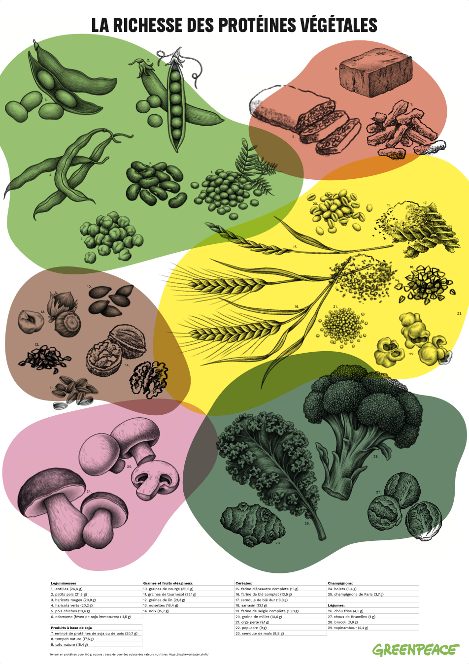 Légumineuses, céréales, noix… Notre poster vous présente toutes les sources de protéines végétales et locales, avec des indications précises pour 100 g. Toutes les informations nutritionnelles sont tirées de la base de données suisse des valeurs nutritives.